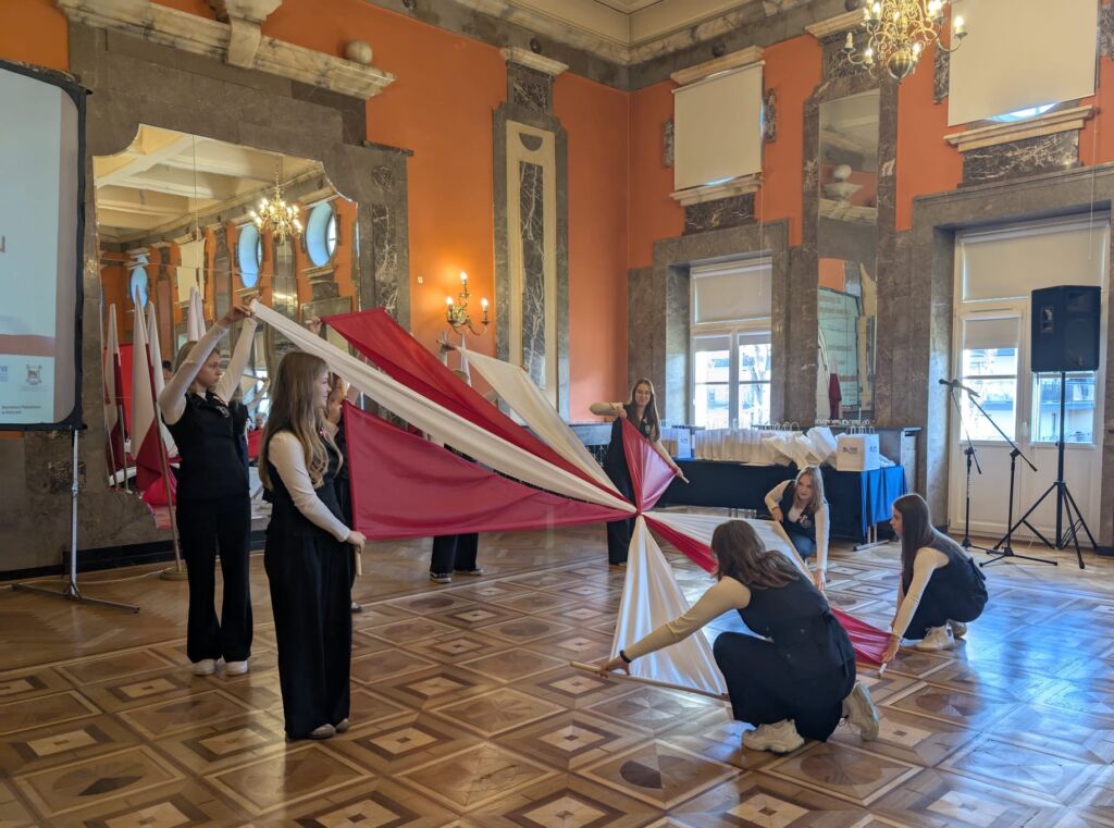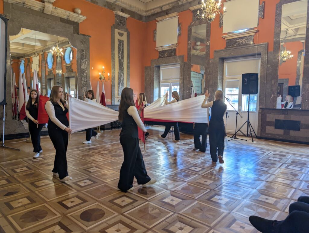 Na zakończenie zabrali głos goście, którzy wyrazili uznanie dla organizatorów oraz złożyli gratulacje laureatom, życząc im dalszych sukcesów naukowych. Całość uświetniły pieśni patriotyczne wykonane przez Filipa Wyspiańskiego z kl. IIA LO oraz zespołu kameralnego z naszej szkoły podstawowej pod kierunkiem p. dr Małgorzaty Banasińskiej-Barszcz. Niespodzianką dla wszystkich był piękny taniec z flagami wykonany przez uczennice kl. IIB LO do akompaniamentu Mikołaja Koszary, ucznia klasy IC.