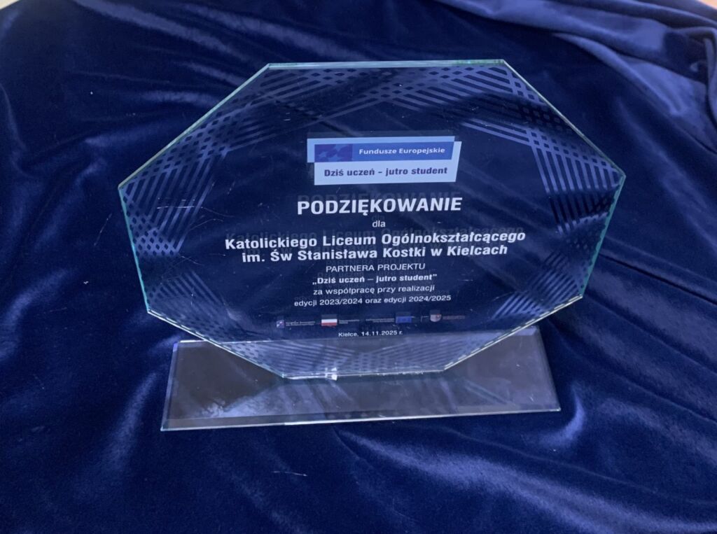 14 listopada 2025 roku, w Politechnice Świętokrzyskiej odbyło się wydarzenie promocyjno-informacyjne podsumowujące 2-letnią realizację projektu „Dziś uczeń-jutro student”, w którym od 2023 r. uczestniczy nasze liceum. W wydarzeniu uczestniczyli m.in. p. marszałek Renata Janik oraz rektor Politechniki Świętokrzyskiej prof. Zbigniew Koruba. Celem projektu jest wspieranie młodzieży w rozwijaniu kompetencji kluczowych, poszerzaniu wiedzy, świadomym planowaniu ścieżek kariery oraz przygotowaniu do dalszej edukacji na poziomie akademickim. Projekt ten obejmuje szereg różnorodnych działań edukacyjnych: dodatkowe zajęcia z języka angielskiego oraz przedmiotów matematyczno – przyrodniczych, warsztaty z doradztwa zawodowego, konkursy, warsztaty na uczelniach itp. Za dotychczasowe zaangażowanie w projekt Katolickie LO otrzymało pamiątkową statuetkę.