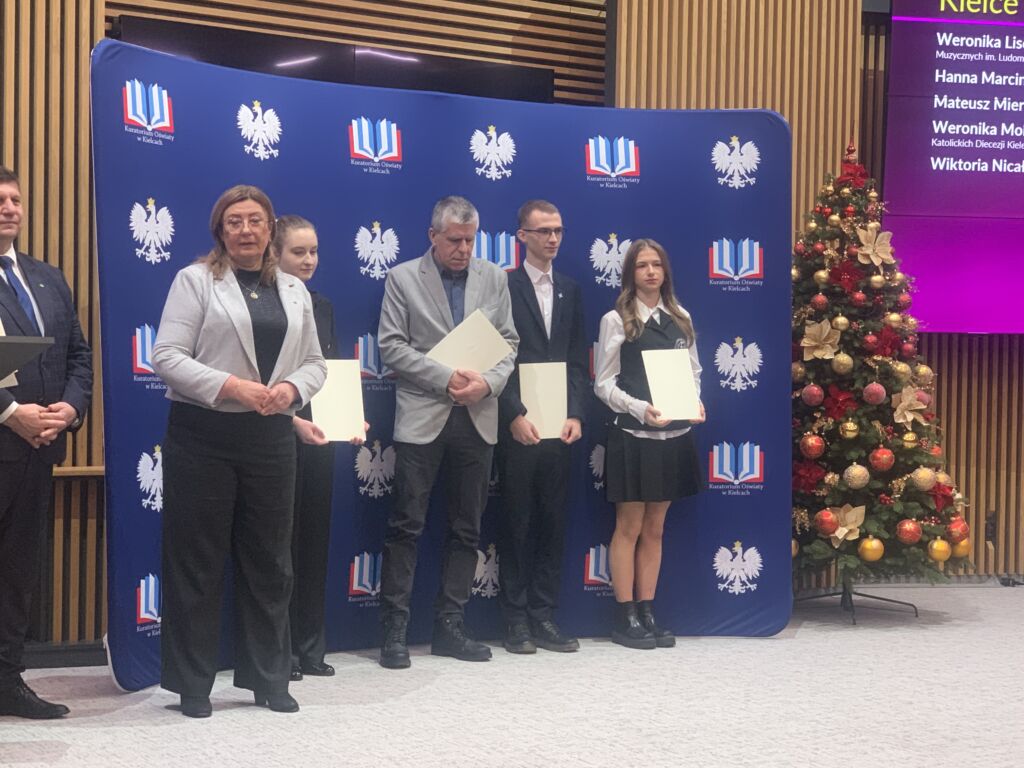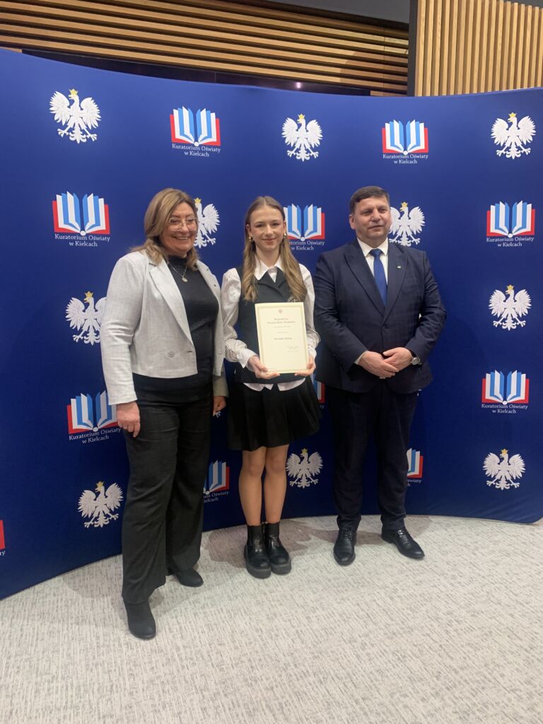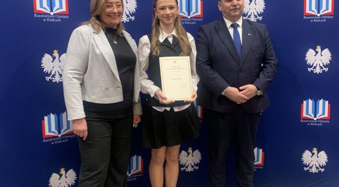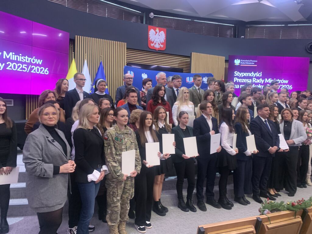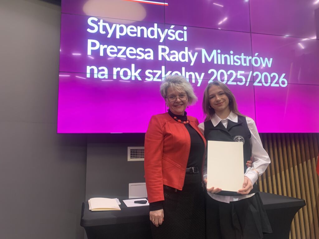 Weronika Molęda uczennica klasy IIIA naszego liceum została stypendystą Prezesa Rady Ministrów. Uroczysta gala z udziałem wicewojewody świętokrzyskiego p. Michała Skotnickiego i świętokrzyskiego wicekuratora oświaty p. Grażyny Dekiel odbyła się w piątek 16 grudnia 2026 w Urzędzie Wojewódzkim. Nagroda dla Weroniki jest jej sukcesem za najwyższą średnią ocen w szkole – 5,86 w roku 2024/2025 oraz sukcesy w konkursach tanecznych. Serdecznie gratulujemy i ogromnie się cieszymy 🙂