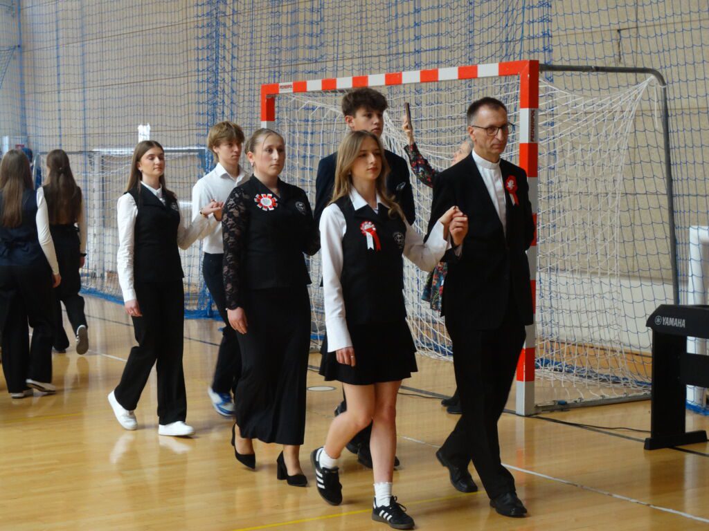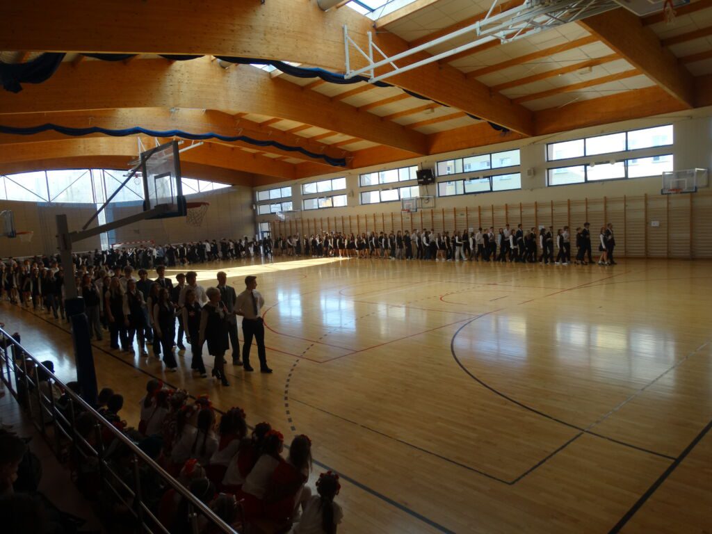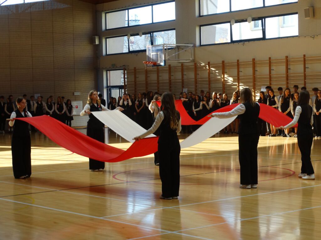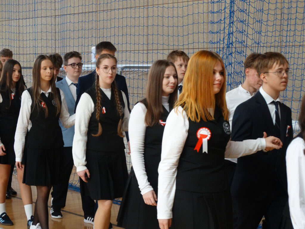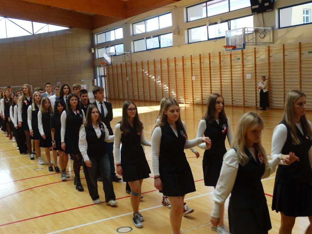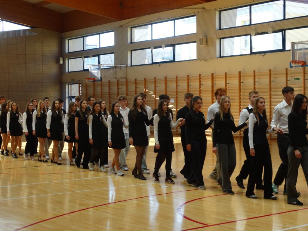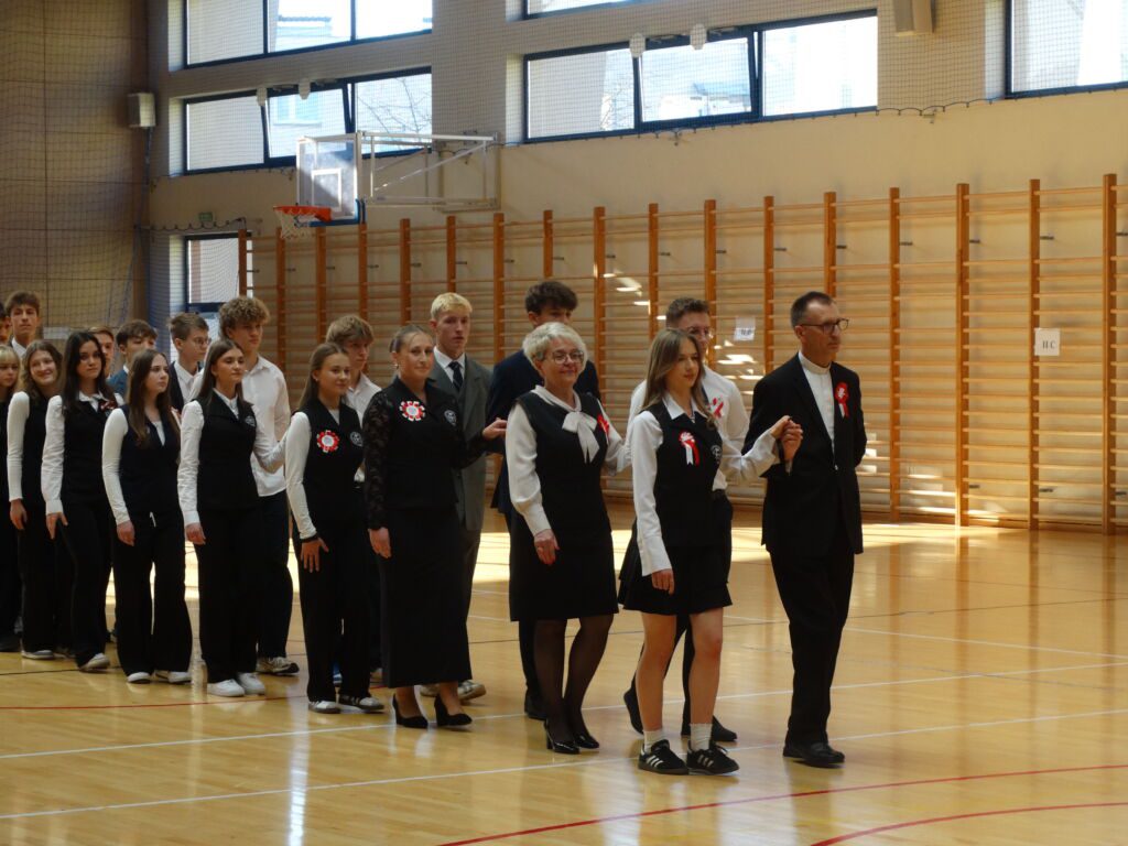 Piątek 7 listopada uczniowie Kostki przeżyli w atmosferze Święta Niepodległości. Cała społeczność szkolna, odświętnie ubrana z akcentem biało-czerwonym o godzinie 11.11 zgromadziła się na hali sportowej, by wspólnie odśpiewać hymn państwowy. Tego dnia gościli w naszej szkole: p. porucznik Jerzy Zawadzki, wyjątkowy gość, uczestnik Powstania Warszawskiego, który po raz kolejny świętował z nami rocznicę odzyskania niepodległości, p. pułkownik Bolesław Kułakowski – emerytowany nauczyciel naszej szkoły, p. Stanisław Rozin ze Stowarzyszenia Osób Represjonowanych w PRL-u, oraz prezes Towarzystwa Szkoły Katolickiej p. Andrzej Ławicki. Pięknym tegorocznym akcentem był taniec z flagami przygotowany przez uczennice z klasy IIB przy akompaniamencie ucznia klasy IC Mikołaja Koszary. Do tradycji KOSTKI należy też odtańczenie poloneza, narodowego tańca wyrażającego piękno polskiej kultury. Licealiści zaprezentowali się w tańcu bardzo pięknie. Korowód 122 par poprowadzili ksiądz dyrektor Jacek Kopeć i pani wicedyrektor Anna Pierzak.