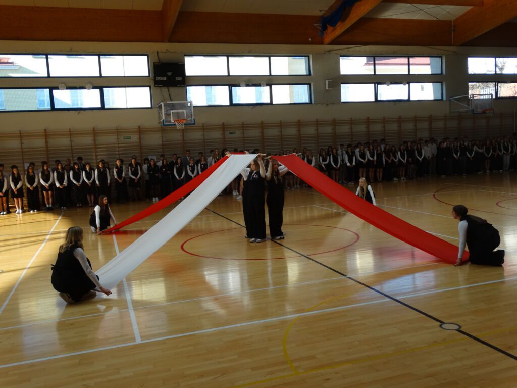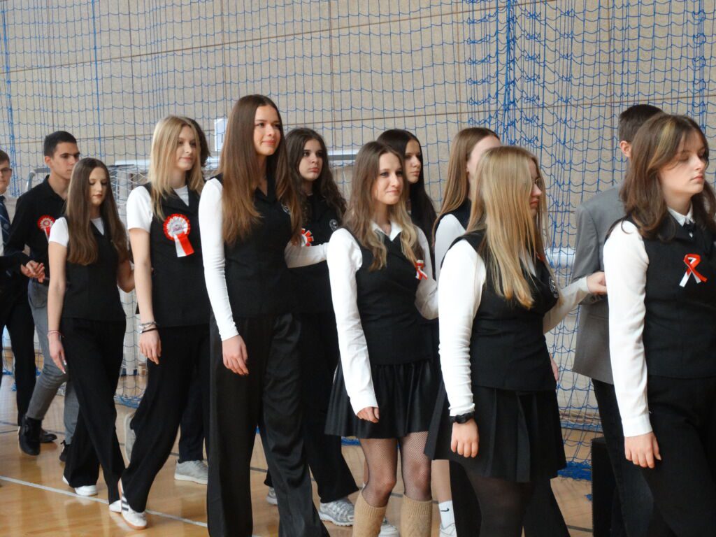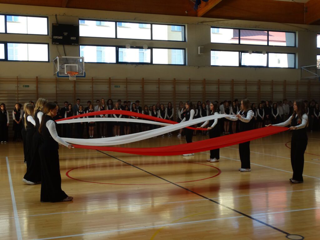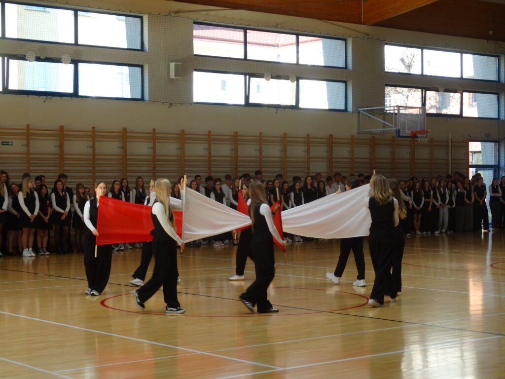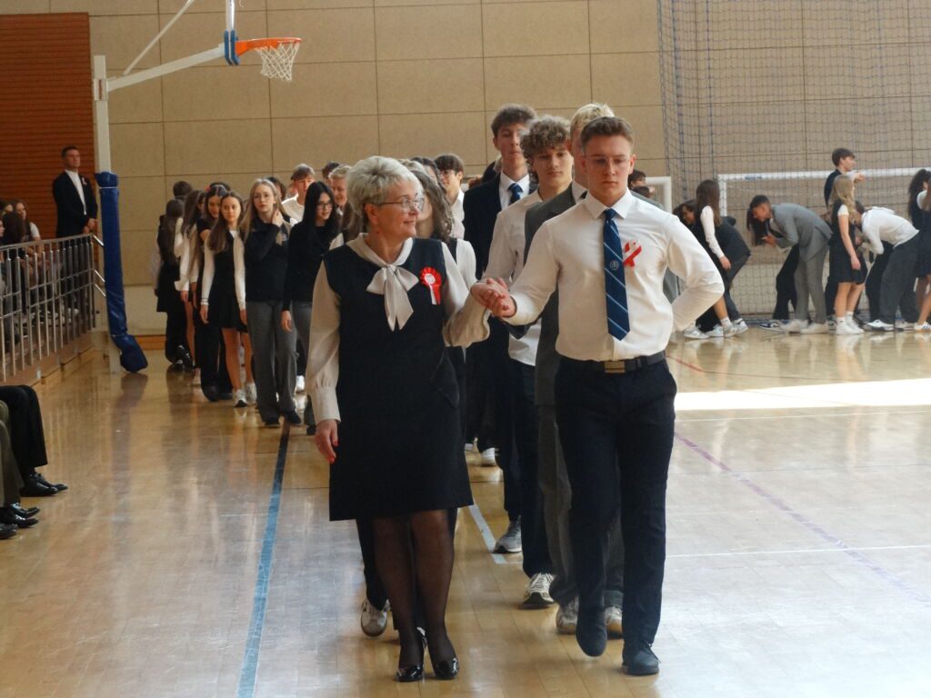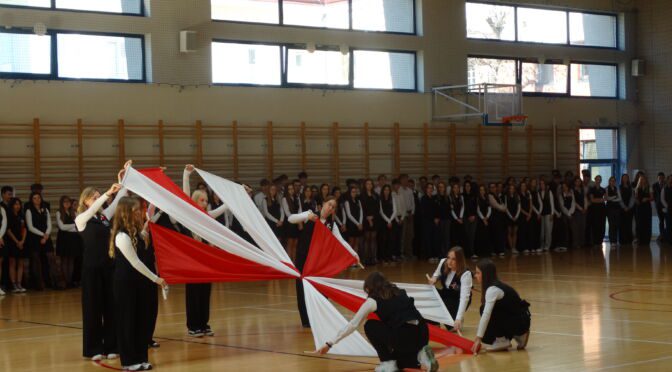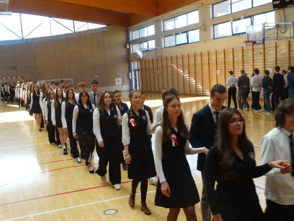 Piątek 7 listopada uczniowie Kostki przeżyli w atmosferze Święta Niepodległości. Cała społeczność szkolna, odświętnie ubrana z akcentem biało-czerwonym o godzinie 11.11 zgromadziła się na hali sportowej, by wspólnie odśpiewać hymn państwowy. Tego dnia gościli w naszej szkole: p. porucznik Jerzy Zawadzki, wyjątkowy gość, uczestnik Powstania Warszawskiego, który po raz kolejny świętował z nami rocznicę odzyskania niepodległości, p. pułkownik Bolesław Kułakowski – emerytowany nauczyciel naszej szkoły, p. Stanisław Rozin ze Stowarzyszenia Osób Represjonowanych w PRL-u, oraz prezes Towarzystwa Szkoły Katolickiej p. Andrzej Ławicki. Pięknym tegorocznym akcentem był taniec z flagami przygotowany przez uczennice z klasy IIB przy akompaniamencie ucznia klasy IC Mikołaja Koszary. Do tradycji KOSTKI należy też odtańczenie poloneza, narodowego tańca wyrażającego piękno polskiej kultury. Licealiści zaprezentowali się w tańcu bardzo pięknie. Korowód 122 par poprowadzili ksiądz dyrektor Jacek Kopeć i pani wicedyrektor Anna Pierzak.
